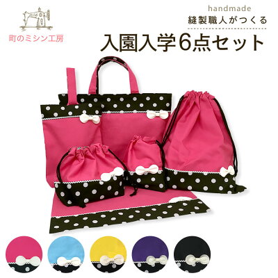 【宅急便送料無料】入園・入学グッズ5点セット(お名前シール5枚付き)【日本製】【リボンドット柄】 レッスンバッグ お弁当袋 上履き入れ 体操服入れ 巾着 女の子 裏地付 入学 新学期 ハンドメイド ギフト プレゼント