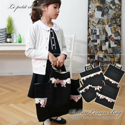 レッスンバッグ 5点 セット 女の子 子供 日本製 リボン おしゃれ 入学 入園 グッズ ブラック 黒 裏地 あり マチ付 ポケット 上履き入れ 入園バッグ お稽古バッグ シューズバッグ コップ袋 体操服入れ リュック ナップサック 巾着 入学準備 ハンドメイド 【あす楽】