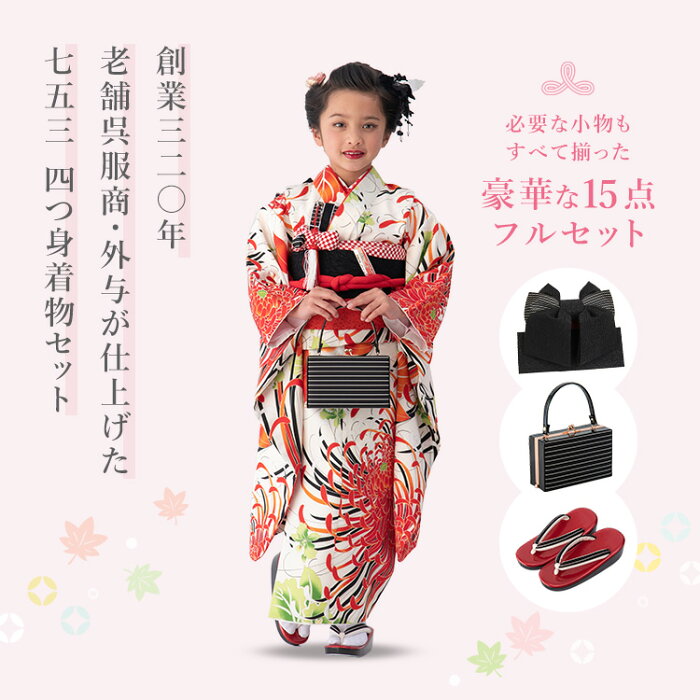 ▼アイテム キーワード 七五三 753 着物 きもの 四つ身 四ツ身 よつみ 四つ身着物 四つ身セット 着物セット フルセット セット フルコーデ フルコーディネート トータル 7歳 7歳用 七歳 七歳用 7才 女の子 女子 女児 子供 こども 子ども ガール キッズ 七五三参り お正月 正月 初詣 雛祭り ひな祭り ひなまつり 桃の節句 七草祝い 七草 結婚式 入学式 卒園式 発表会 誕生日 記念日 お祝い 祝着 衣装 和服 和装 和柄 和風 結び帯 作り帯 帯 志古貴 しごき 帯締め 箱せこ 箱迫 筥迫 はこせこ 箱迫セット 箱せこセット 筥迫セット バッグ 鞄 草履 重ね衿 長襦袢 扇子 びら簪 腰紐 足袋 着付け小物 前撮り 記念撮影 撮影 販売 購入 京都 老舗 箱入り のし対応 のし 熨斗 贈り物 ギフト プレゼント おすすめ 高級 豪華 華やか おしゃれ お洒落 かわいい 可愛い カワイイ モダン レトロ 総柄 花柄 黒 ブラック 赤 レッド 生成り クリーム 乱菊 菊 蘭生成り地に乱菊と蘭 七五三・お正月・雛祭りなどで着ていただける「7歳用着物&結び帯」に着付け小物が付いた15点セットをお届けします♪