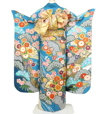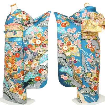 振袖 レンタル フルセット < 地紙に菊 / 水色 > 往復送料無料 成人式 結婚式 披露宴 結納 女性 振り袖 振袖セット 振袖レンタル 安い コスプレ レトロ プレタ 紺 青 正絹 【レンタル】